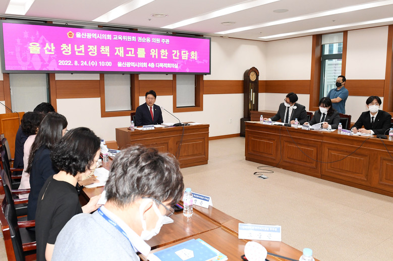 [울산 세계타임즈=이호근 기자] 울산광역시의회 교육위원회 권순용 의원과 안대룡 의원은 24일 오전 10시 울산대학교 총학생회 임원진과 울산과학대학교 총학생회 임원진을 비롯한 13명의 울산 청년들, 울산시 관계공무원 등과 함께 울산 청년정책 재고를 위한 간담회를 개최하고 현재 시행되고 있는 울산 청년정책에 대해 논의했다.