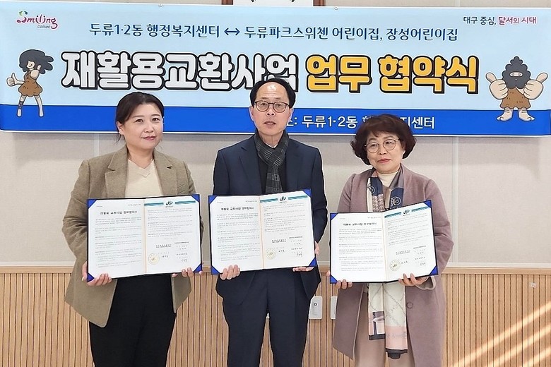 [달서구 세계타임즈=한윤석 기자] 대구 달서구 두류1‧2동(동장 마규봉)은 두류파크스위첸어린이집(원장 정원례), 장성어린이집(원장 신정숙)과 함께 ‘재활용품 교환사업’을 위한 업무협약(MOU)을 체결했다고 밝혔다.