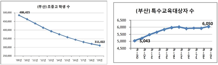 [부산=세계타임즈 장경환 기자] 10년 전 대비 부산지역 초중고 학생수는 36% 감소하여 전국 최고의 감소율을 보인 반면, 특수교육대상자는 5,043명에서 6,050명으로 1천 명 넘게 증가(20%↑)했다. 그러나 최근 솔빛학교 이전 및 부산대부설특수학교 신설 문제에서 보듯 특수학교 설립에 관한 추진은 님비현상 등의 이유로 지지부진한 실정이다.