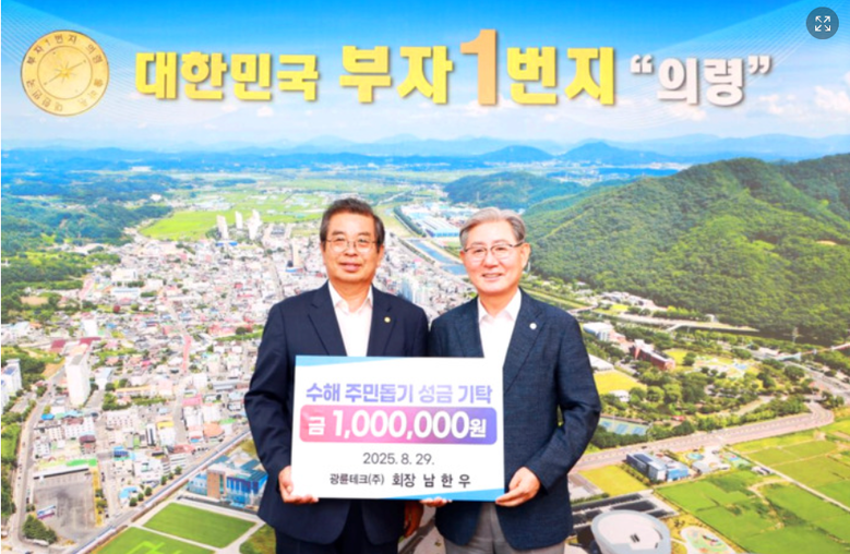 의령군은 최근 집중 호우로 큰 피해를 입은 지역의 복구를 돕기 위해 광륜테크(주)남한우 회장이 성금 100만 원을 기탁했다고 밝혔다