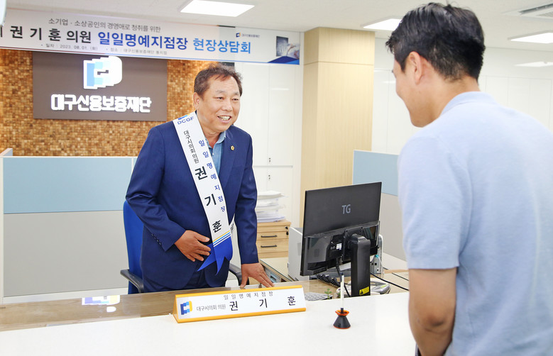 [대구 세계타임즈=한성국 기자] 권기훈 의원(경제환경위원회, 동구3)은 8월 1일(화) 대구신용보증재단(이하 대구신보) 동지점을 찾아 지역 소상공인들로부터 민생경제 일선에서 겪고 있는 고충을 듣고 보증상담을 하는 등 일일명예지점장으로 활약했다.