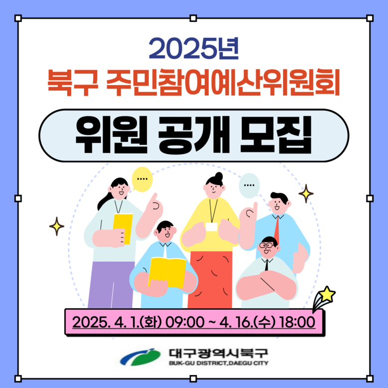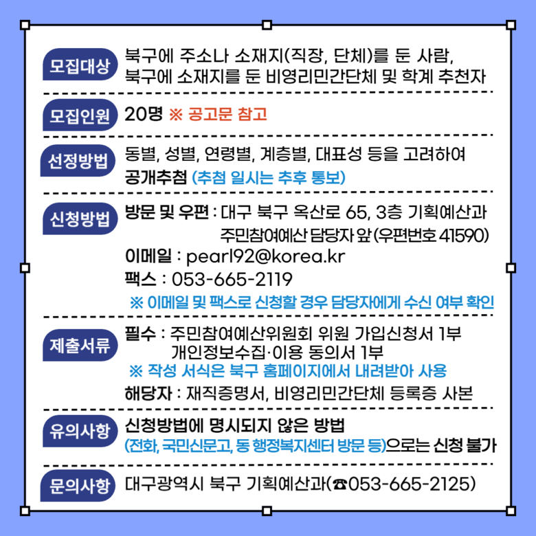 신청자격은 공고일 현재 대구 북구에 주소나 직장을 두고 있는 사람, 북구에 소재한 비영리민간단체 및 학계 추천자면 누구나 신청이 가능하다. 특히, 사회적 약자(아동, 여성, 노인, 장애인, 저소득층 등)와 청년위원(만19세 이상, 만39세 이하)을 우선 선발하며, 모집인원보다 신청자가 초과할 경우, 동별·성별·연령별·계층별·대표성 등을 고려하여 최종 선정할 예정이다.