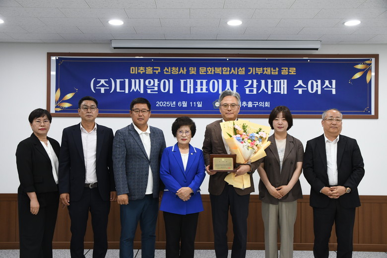 [미추홀구 세계타임즈=심하린 기자] 미추홀구의회(의장 전경애)는 11일 미추홀구의회 세미나실에서 ㈜디씨알이 정창현 대표이사에게 감사패를 수여하는 뜻깊은 행사를 개최했다. 이번 감사패 수여식은 ㈜디씨알이가 미추홀구 신청사 및 문화복합시설 건립을 위한 기부채납을 통해 지역사회에 기여한 공로를 기리기 위해 마련됐다.