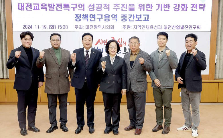 [대전 세계타임즈=이채봉 기자] 대전시의회 의원연구회인 「지역인재육성과 대전산업발전 연구회」(회장 박주화 의원)는 19일 시의회 소통실에서 ‘대전교육발전특구의 성공적 추진을 위한 기반 강화 전략 연구용역’ 중간보고회를 개최했다.