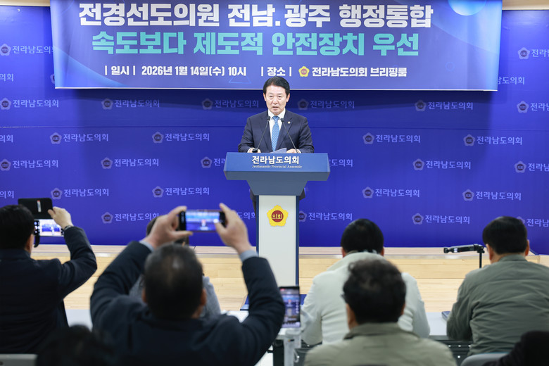 [전남 세계타임즈=우덕현 기자] 전라남도의회 전경선 의원(더불어민주당·목포5)은 14일, 전라남도의회 브리핑룸에서 기자회견을 열고, 전남-광주 행정통합과 관련해 “통합의 큰 방향과 대의에는 동의하며 적극 지지하지만, 속도전 통합이 아닌 제도적 안전장치가 우선돼야 한다”고 밝혔다.