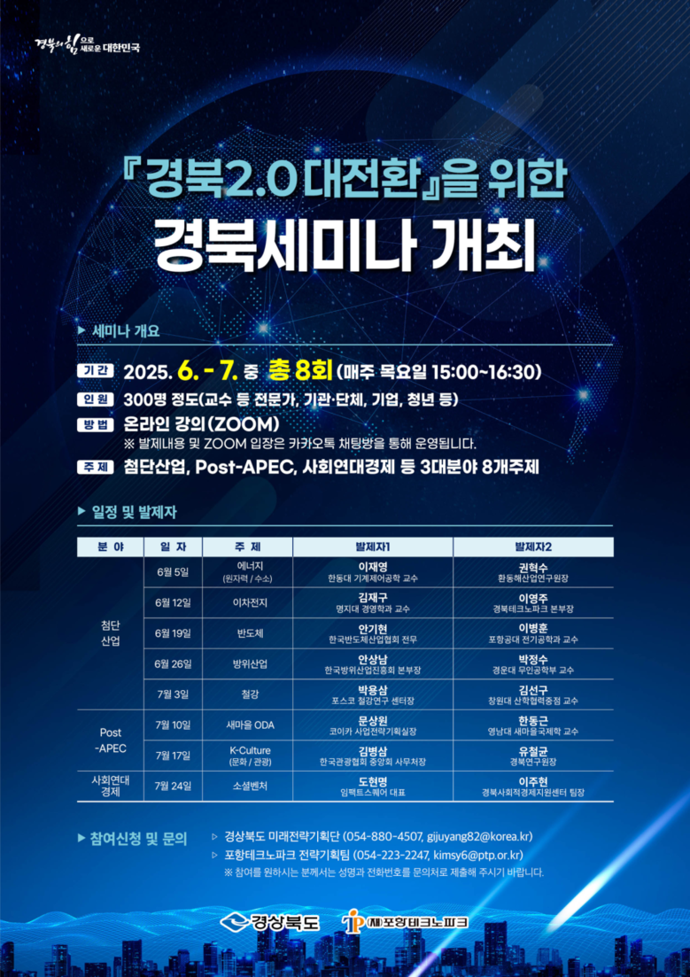 경북 세미나는 관련 기관 전문가, 기업, 청년 등 도민은 누구나 참여할 수 있다. 자세한 문의는 경북도 미래전략기획단, 포항테크노파크 전략기획팀으로 하면 된다.