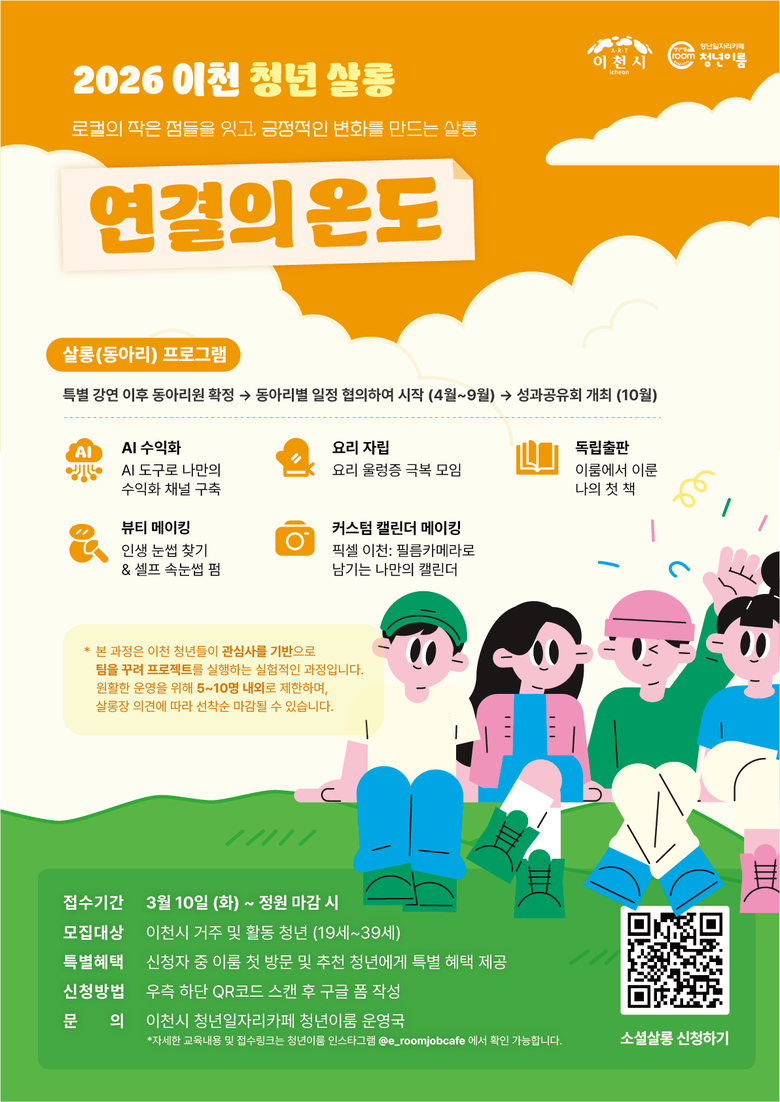 ▲인공지능(AI) 도구를 활용한 수익화 채널 구축을 목표로 하는 ‘인공지증(AI) 수익화’ ▲요리 초보 탈출을 위한 ‘요리 자립’ ▲나만의 책을 발간해 보는 ‘독립출판’ ▲퍼스널 컬러와 셀프 뷰티를 배우는 ‘뷰티 메이킹’▲필름 카메라로 이천의 사계절을 담는 ‘커스텀 캘린더 메이킹’까지 총 5개의 살롱으로 구성한 본 콘텐츠는 살롱별로 5~10명 내외의 소규모 인원으로 운영되며, 19세 이상 39세 이하 관내 청년이면 누구나 홍보 포스터 내 큐알코드를 스캔하여 신청할 수 있다.