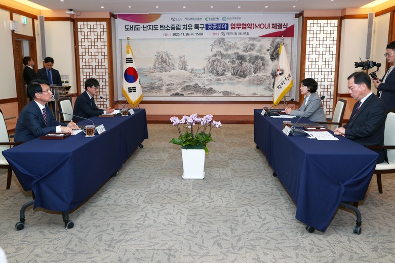시는 지난 26일 당진시청 해나루홀에서 오성환 당진시장, 김양수 당진도시공사사장, 전희경 충남연구원장, 이종규 충남산학융합원장이 참석한 가운데‘도비도-난지도 탄소중립 치유 특구 공공분야 업무협약’을 체결했다고 27일 밝혔다.