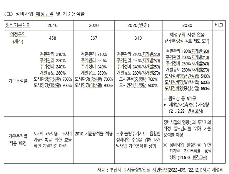 ◈ 내년 시행 예정인 「2030정비기본계획 타당성 검토 용역」에서 문제점 걸러내고 합당하게 재정비 필요 주장 [부산 세계타임즈=이용우 기자] 「부산시 2030정비기본계획」에서 처음 도입된 주거지관련 정비사업의 ‘기준용적률 산정 점수표’를 폐지하라는 주장이 제기되었다.