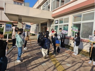 본교는 등교 시간에 맞추어 학생회 학급 임원을 중심으로 캠페인을 실시하였다. 학생회 임원들은 <보행 중 스마트폰 금지> , <길을 걸어가며 스마트폰을 사용하지 않아요>, <청렴한 학교 안전한 학교> 캠페인 피켓을 직접 들고 등교하는 친구들에게 홍보하였으며, 학교 앞 안전속도 30km 서행, 교문 앞 주정차 금지 등 운전자의 운전 법규 준수, 청렴한 학교 문화 만들기를 강조하였다.