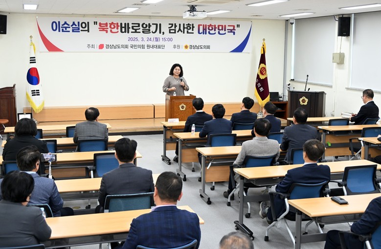[경남 세계타임즈=최성룡 기자] 경상남도의회 국민의힘 의원단은 24일 오후 3시, 도의회 대회의실에서 탈북 간호장교 출신이자 방송인으로 활동 중인 이순실 강사를 초청해 특별 강연을 개최했다.