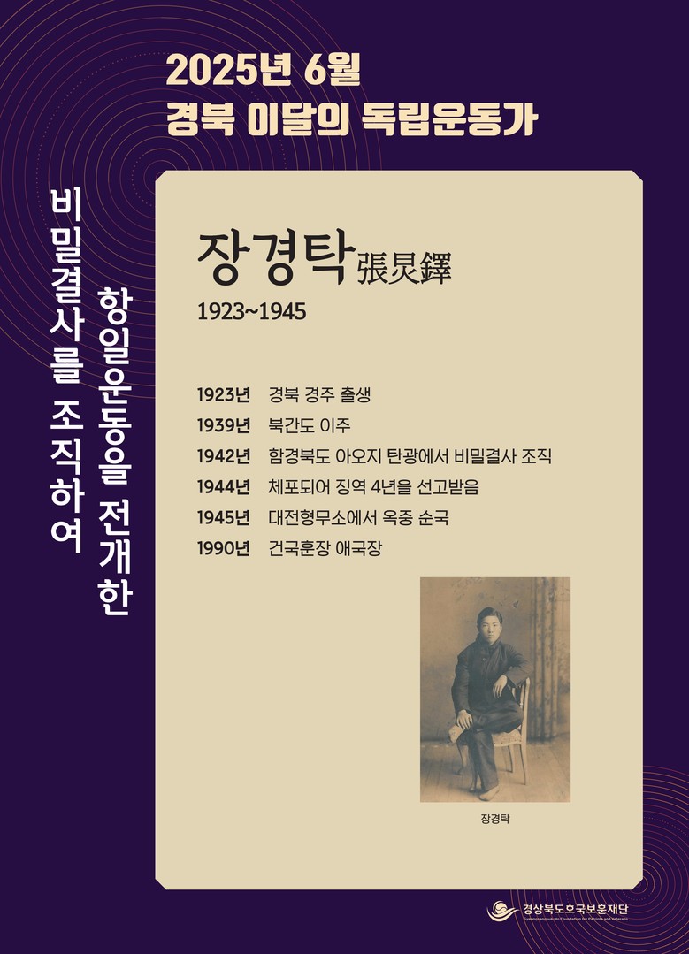 장경탁 선생은 경상북도 월성군(현 경주시) 현곡면 금장리 출생으로 일제강점기 함경북도 아오지 탄광에서 비밀결사를 조직해 항일운동을 전개하며 민족 독립을 위해 헌신한 인물이다.