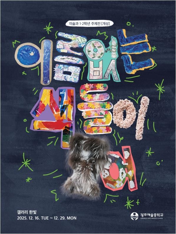 광주예술중은 오는 16~29일 교내 한빛 갤러리에서 ‘이름 없는 색들이 모여’를 주제로 열린다. 전시에서는 ▲요즘 어때요?(2학년 이가람 학생) ▲개성 덩어리(2학년 이채원 학생) ▲향(1학년 김강윤 학생) 등 미술과 1, 2학년 학생 41명의 작품을 만나볼 수 있다. 학생들은 작품을 통해 획일성 속에서 자신의 색을 지키기 위한 내면의 성찰과 진정한 ‘나다움’의 의미를 독창적인 방식으로 풀어냈다. 관람 시간은 평일 오전 8시30분부터 오후 5시까지다.