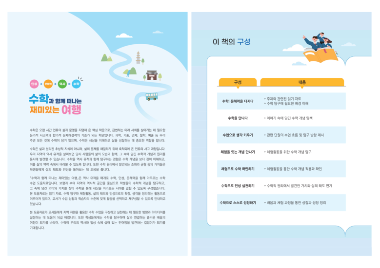 이번 자료집은 문제 풀이 중심의 수학 학습에서 벗어나 읽기와 탐구, 체험을 연계한 수업을 통해 학생들이 수학을 생활 속에서 이해하도록 돕기 위해 개발됐다. 특히 수학 문해력 향상과 수학적 가치 이해를 바탕으로 한 인성교육 실천을 지원하는 데 목적이 있다.