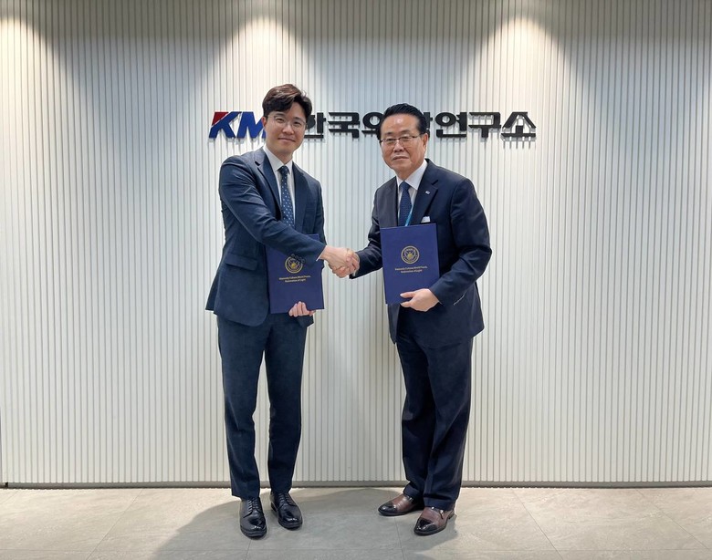 | ▲ HWPL 강태호 사무총장과 KMI 수원센터 상묵 터장이 협약 후 악수를 하고 있다 [사진제공 = HWPL] |