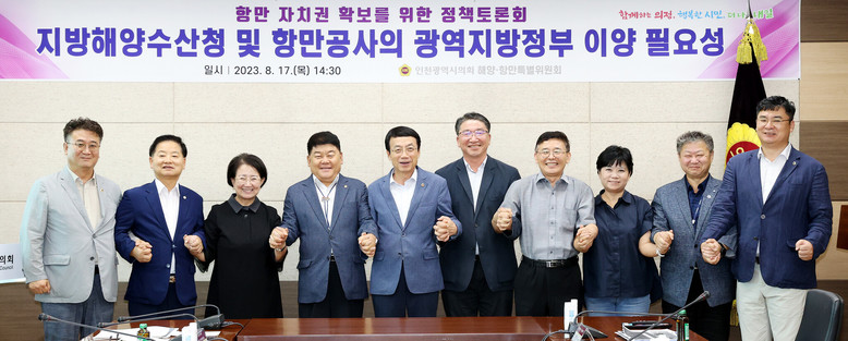 인천광역시의회 해양·항만 특별위원회(위원장 박창호)는 17일 시의회 본관 3층 의원총회의실에서 허식 의장과 박창호 위원장을 비롯해 이순학·김종배·박판순·조현영·유승분 의원, 주제발표자, 토론자 등이 참석한 가운데 ‘지방해양수산청과 항만공사의 광역지방정부 이양 필요성’을 주제로 토론회를 개최했다.