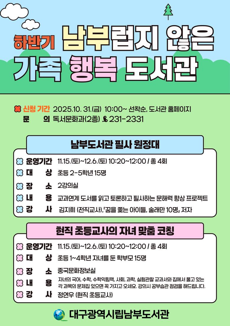 두 과정 모두 10월 31일(금)부터 도서관 누리집(library.daegu.go.kr/nambu)을 통해 회원가입 없이 신청할 수 있다. 자세한 사항은 도서관 누리집 또는 독서문화과(☎231-2331)로 문의하면 된다.