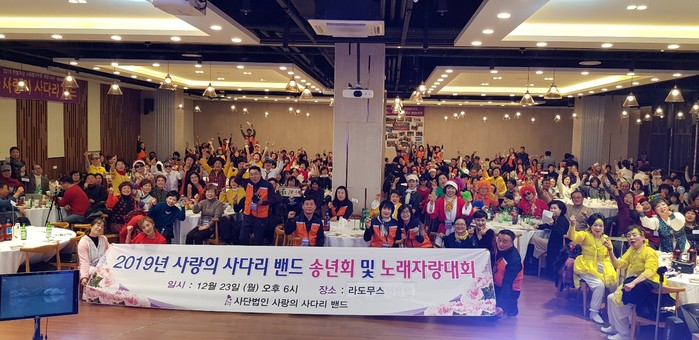 [대전=세계타임즈 이채봉 기자] 대전시 SNS 8천명 봉사단체 사랑의 사다리 밴드(리더 이정제)는 지난23일 오후6시, 라도무스웨딩홀에서 2019송년회 및 노래자랑으로 자원봉사자 상호간에 화합과 결속을 통해서 더 나은 봉사를 위한 다짐의 송년회를 개최했다.