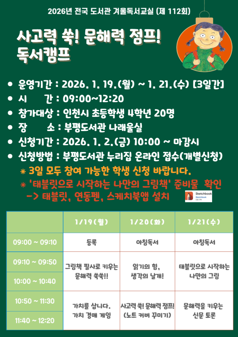 자세한 사항은 부평도서관 누리집을 확인하거나 어린이자료실(☎032-510-7361)로 문의하면 된다.