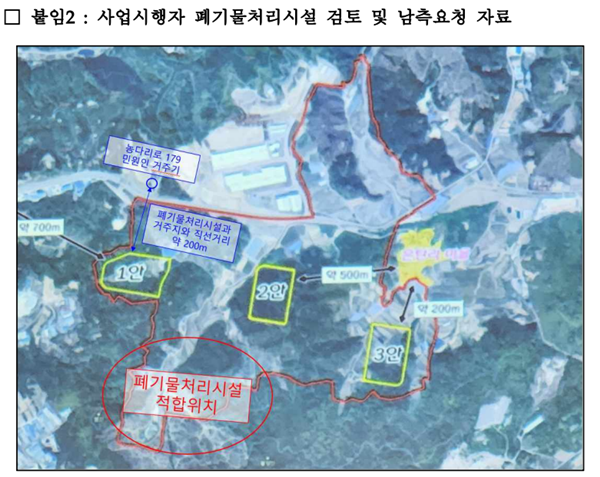 이 말을 들은 K 씨는 폐기물 매립지를 산업단지 내에서 조금만 옮겨서 부모님이 살고 계신곳과 약 800m 정도만 떨어져서 라도 시설을 하면 어떻겠냐고 요청을 하였으나 이 마저도 충청북도와 진천군은 받아들여 주지 않고 이미 각 기관에서 사업승인 협의가 끝난 상태이며 특히 금강 환경청 승인이 났다는 이유로 폐기물매립지를 조금도 옮길 수 없다고 답변했다.