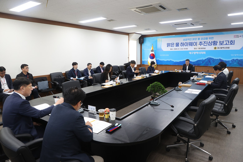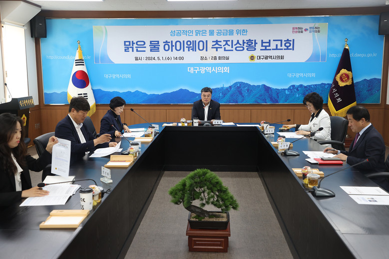 [대구 세계타임즈=한윤석 기자] 대구시의회 맑은물공급추진특별위원회(위원장 김원규)는 5월 1일(수) 시의회 2층 간담회장에서 ‘맑은 물 하이웨이’ 사업 추진 상황을 점검하고 성공적인 맑은 물 공급 방안과 협력 사항을 모색하기 위해 집행부와 간담회를 가졌다.