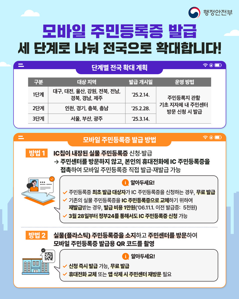 2월 14일부터 전남‧북, 대구, 대전, 울산, 강원, 경남‧북, 제주에서 전국발급 1단계가 시행되나, 전국발급 4단계가 완료될 때까지는 주소지 읍면동 행정복지센터에서만 발급 신청할 수 있다.