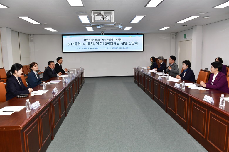 이날 간담회에서 정 의장은 “국가폭력의 아픔을 겪었던 광주·전남·제주 지역 간의 상호협력을 위해 지난해 11월에 3개 시도의회가 민주평화벨트 구축을 위한 업무협약을 맺었다”면서 “4월 중에 광주시의회에서 제주4·3항쟁 교육을 하고, 5월에는 제주도의회에서 5·18 교육을 하는 방식으로 교차 교육을 실시하자”고 김경학 의장에게 제안했다.