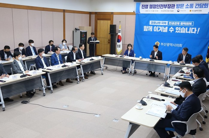 소통간담회는 시장 권한대행 체제 전환에 따른 현황을 둘러보기 위해 부산시를 방문한 진영 행정안전부 장관이 시의회를 방문함에 따라 이뤄졌다. 이 자리에는 시의회 박인영 의장, 김진홍 부의장, 변성완 시장권한대행 등이 참석했다.