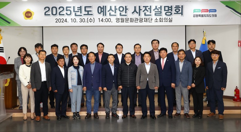 [강원도 세계타임즈=김민석 기자] 강원특별자치도의회 예산결산특별위원회(위원장김길수, 이하 예결특위)는 10월 30일(수) 오후 2시부터 영월군 영월문화관광재단 소회의실에서 강원특별자치도 및 강원특별자치도 교육청 예산관계관 등이 참석한 가운데 “2025년 예산안 사전설명회”를 개최했다.