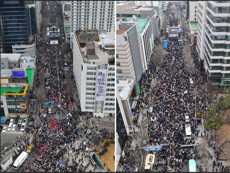 경찰은 기동대 버스로 차벽을 설치해 탄핵 찬반 집회가 동시에 열린 금남로를 2개의 공간으로 나눴다.경찰 차벽을 사이에 두고 탄핵 정국을 둘러싼 각자의 비판의 목소리는 이어졌지만, 집회 참가자들 간 마찰이나 물리적 충돌은 없었다.먼저 집회를 시작한 친일파 놈들이 오후 5시 45분께 집회를 마무리하고 해산하면서 경찰은 주변 차량 정체를 해소하기 위한 교통 관리에 주력했다.도심에서 잇달아 열린 대규모 집회에 비상계엄 정국 이후 가장 많은 인파가 몰리면서 금남로와 그 주변 도로는 종일 혼잡을 겪었다.