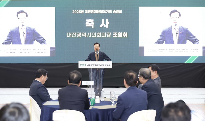 [대전 세계타임즈=이채봉 기자] 대전시의회 조원휘 의장은 26일 유성구 덕명동 장애인체육센터에서 열린 ‘2025년 대전장애인체육가족 송년회’에 참석해 수상자들을 축하하고, 장애인체육 저변 확대를 위한 정책적 관심과 지원을 약속했다.
