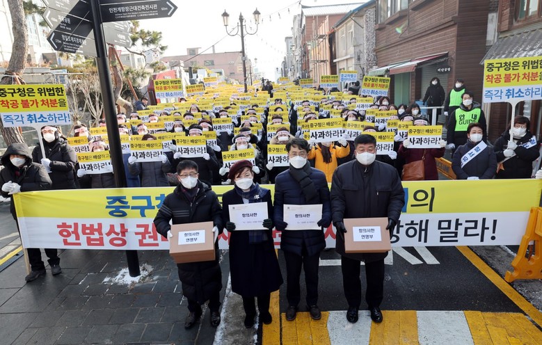 신문모는 이날 궐기대회에서 중구청을 향해 ‘법적 근거도 없는 착공신고 불가 처분을 취소할 것’, ‘신흥동 문화센터(가칭)의 합법적 재산권 행사를 보장할 것’ 등을 요구했다.