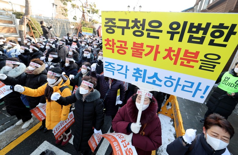 하지만 일부 단체 회원 등 100여 명은 이 건물을 종교시설로 이용할 것이란 근거 없는 예단으로 집회를 열며 건축허가를 내준 중구청을 압박했다. 이에 허가를 내준 중구청이 이들의 압력에 굴복해 지난 7일 ‘착공신고 불가’라는 법에도 없는 불합리한 처분을 했다.
