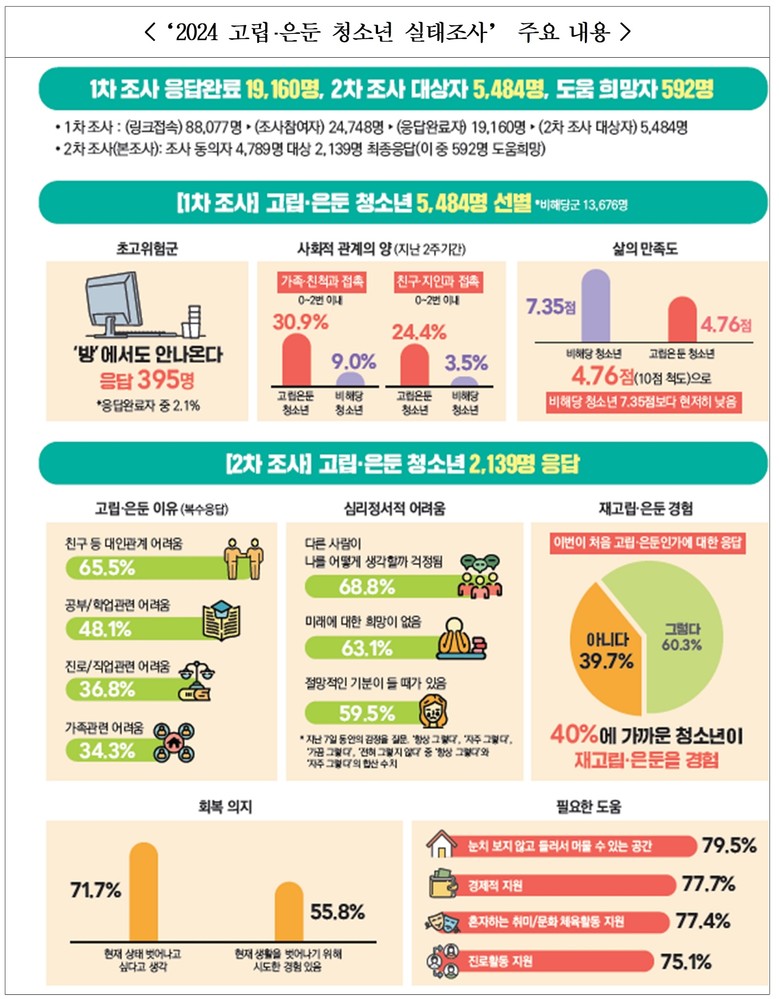 ‘2024 고립·은둔 청소년 실태조사’는 한국청소년정책연구원이 지난해 전국 9~24세 청소년을 대상으로 온라인 웹조사에 참여한 19,160명 가운데 1차 조사를 통해 고립은둔 상태로 판별된 5,484명을 선별한 뒤, 2차 조사(최종응답 : 2,139명)를 한 결과이며, 그 주요 내용은 아래와 같다.