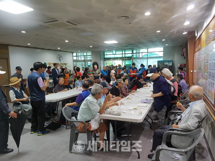 [대전=세계타임즈 이장성 기자] 5천명의 회원들이 활동하는 자발적인 SNS봉사 밴드인 사랑의 사다리 밴드(리더 이정제)는 14일 오전 9시부터 대전광역시 노인복지관(관장 유한봉)에서 점심 급식시간에 500분의 어르신들께 즉석 빵, 부침개, 커피 600개를 전달을 하면서 이웃사랑을 전했다.