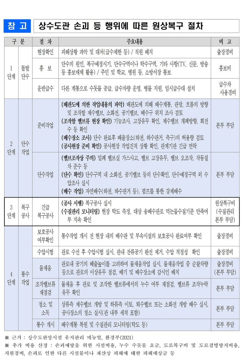 이어, “현행 조례는 관로 손괴 등 행위에 대한 원상복구비용으로 직접공사비, 직원 차량비 및 출장경비, 누수 수돗물 요금 등 직접영향 비용만을 부담하도록 할 뿐, 급수 정상화를 위해 필요한 단수 및 통수작업, 수질관리모니터링 등의 간접비용에 대해서는 수도시설의 관리를 책임지는 ‘상수도사업본부’가 부담하고 있어, 제도개선이 필요하다”며 조례 개정에 나선 배경을 밝혔다.