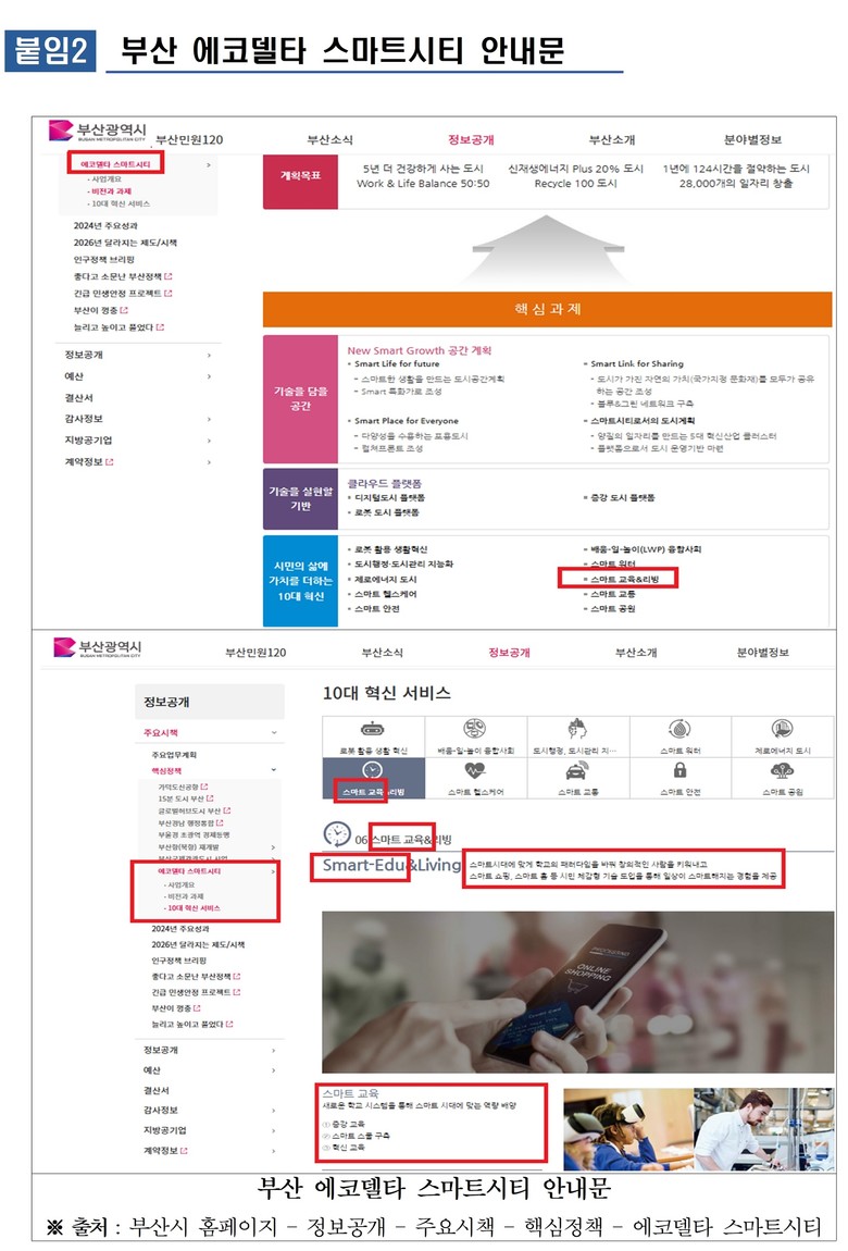 이어 “또한, 부산시 홈페이지에 본 의원이 직접 접속하여 게시된 ‘부산 에코델타 스마트시티 안내문’을 확인해본 결과, ‘비전과 과제’에 ‘스마트 교육’이 분명하게 기재되어 있다. 이뿐만 아니라 ‘10대 혁신 서비스’에도 ‘스마트 교육’이 포함되어 있으며 ▲증강 교육, ▲스마트 학교 구축, ▲혁신 교육 등 새로운 학교 시스템을 통해 스마트 시대에 맞는 역량을 배양하겠다고 명기하고 있다.”라고 설명했다. (상세내용 : 붙임2)