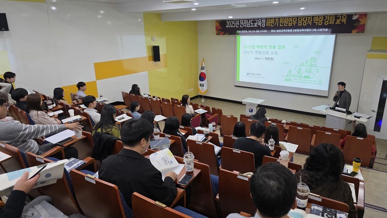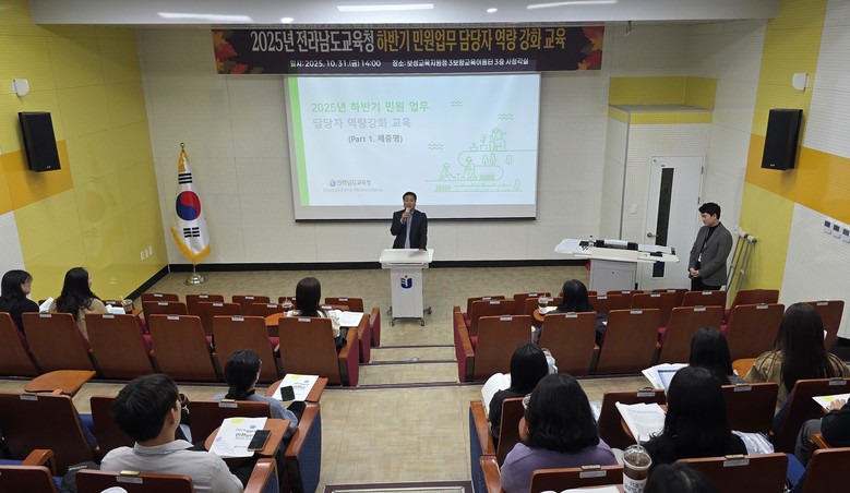 [전남 세계타임즈=우덕현 기자] 전라남도교육청(교육감 김대중)은 31일 보성에서 ‘2025 하반기 민원 업무담당자 역량강화 교육’을 열고, 민원 현장에서의 공감 행정과 신뢰받는 서비스 구현 방안을 모색했다.