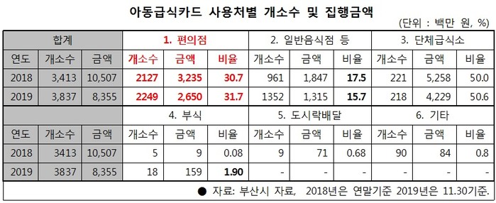 또한, “실제로 아동급식전자카드의 사용처별 집행금액을 보면 단체급식소를 제외하고는 편의점이 1위”라며 “부산시가 취약계층 아이들에게 편의점 먹거리를 강제하는 꼴”이라고 비판했다.