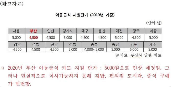 김 의원은 "부산시가 광역시 최초로 유니세프 아동친화도시 인증을 받았음에도 배고픈 아이들을 위한 노력이 부족하다"며 "현재 결식우려아동에게 제공되는 1식 지원단가 4,500원으로는 일반 음식점에서 제대로 된 식사를 하기 어렵다“고 설명했다.