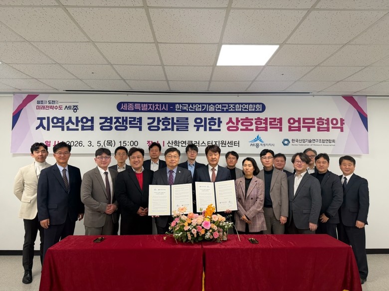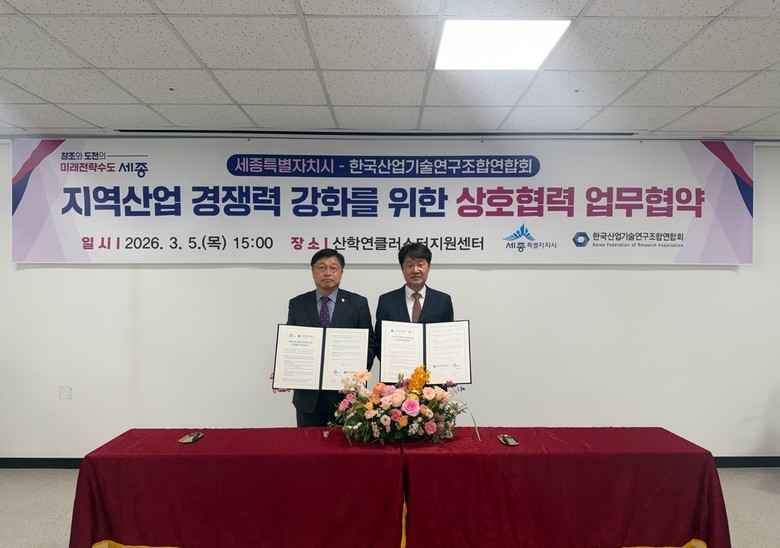 [세종 세계타임즈=이채봉 기자] 세종특별자치시(시장 최민호)가 5일 산학연클러스터지원센터에서 ㈔한국산업기술연구조합연합회(회장 김진우)와 지역산업 경쟁력 강화와 상호 협력을 위한 업무협약을 체결했다.