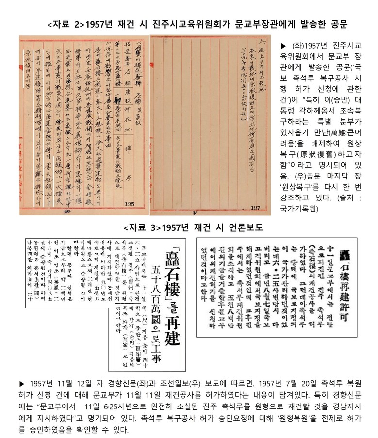 조 의원은 “1937년 조선총독부가 보관하던 촉석루의 실측도면과 1957년 진주시가 문교부장관에게 공사를 허가 받으면서 올린 재건도면은 구조와 규모 등이 모두 일치하고 있다. 이는 촉석루가 원형대로 복원되었다는 사실을 설계도로 입증했다는 의미”라면서 “이와 함께 이승만 대통령의 원형복원 특별지시 및 승인 요청과 이 내용을 담은 언론보도 등은 원형복원 사실을 다시 한 번 입증하고 있다. 2014년 승격 신청 시 이러한 자료들이 없어서 원형 보존 여부가 밝혀지지 않았기 때문에 부결된 것이므로, 이번 자료 발굴로 국가지정문화유산 재지정에 청신호가 켜진 것”이라고 설명했다.