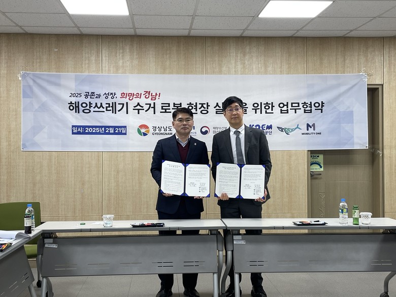 [세계타임즈=경남 최성룡 기자] 경상남도(도지사 박완수)는 21일 ‘대규모 융합 로봇 실증사업 컨소시엄’과 효율적인 해양 부유 쓰레기 수거를 위해 개발 중인 로봇의 현장 실증을 위한 업무협약(MOU)을 체결했다.
