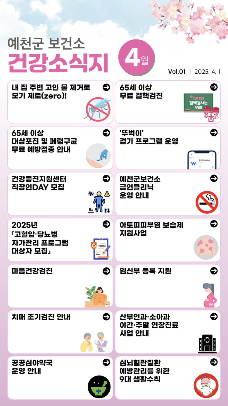 안남기 보건소장은 “다양한 사업과 건강상식 등을 매월 새롭게 업로드 하여 예천군민에게 가까이 다가가는 보건소가 되도록 하겠으며, 소식지를 통해 예천군민에게 보건소의 다양한 사업을 알리고 보건소의 활동내용을 공유해 예천군민의 건강 증진에 기여하겠다”고 말했다.