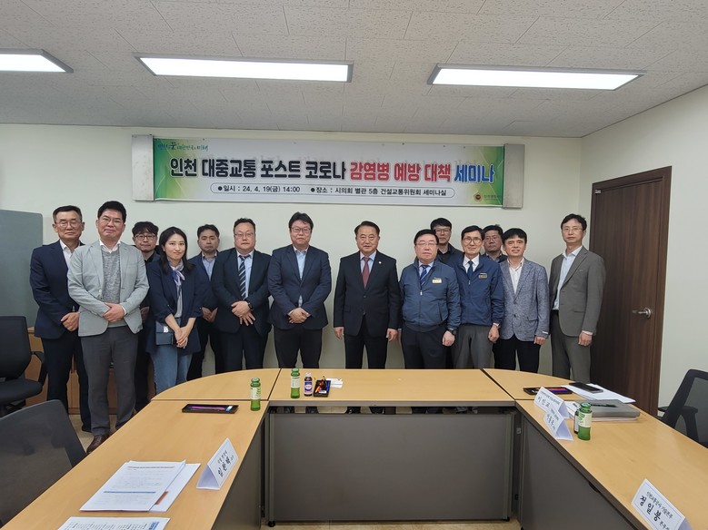 이인교 부위원장은 최근 건설교통위원회 세미나실에서 국립한경대 임완택 교수, 풍산소재기술연구원 박철민 원장, 인천시 이동우 교통정책과장, 인천교통공사 정일봉 기술본부장 등이 참석한 가운데 대중교통 이용 시민들의 감염병에 대한 불안감을 줄이고자 ‘인천 대중교통(지하철·버스) 포스트 코로나 감염병 예방 대책 세미나’를 개최했다고 22일 밝혔다.