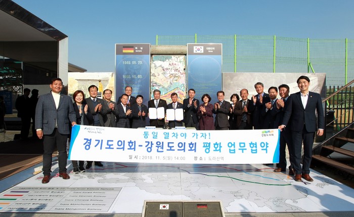[강원도=세계타임즈 김민석 기자] 강원도의회(의장 한금석)는 경기도의회와 남북교류사업 협력 및 DMZ 공동개발을 위하여 11월 5일 오후 2시에 도라산역(경기도 파주)에서 ‘평화 업무협약’을 체결하였다.