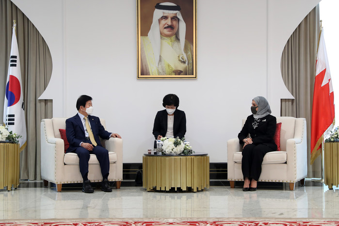 아울러 박 의장은 “바레인의 ‘경제 비전 2030’ 계획에서 산업 다각화, 지식경제 분야의 발전내용을 담고 있는 것으로 안다. 한국의 그린 뉴딜 및 디지털 뉴딜과 협력할 분야가 아주 넓다고 생각한다”면서 양국의 심화된 교류·협력의 필요성을 역설했다.
