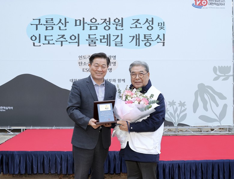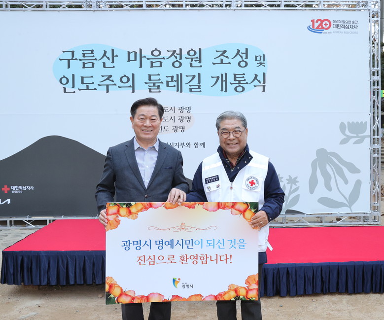 시는 14일 구름산 산림욕장에서 대한적십자사 경기도지사와 함께 개최한 ‘마음정원 조성 및 인도주의길 개통식’에서 이 회장에게 광명시 명예시민증을 수여했다.