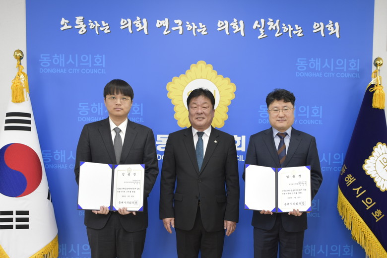 [동해시 세계타임즈=김민석 기자] 동해시의회(의장 이동호)는 20일, 의회 의장실에서 2023년 동해시의회 정책지원관 경력채용시험에 최종 합격한 2명에게 임용장을 수여했다.