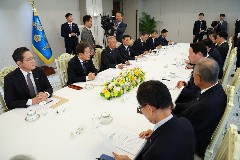이 대통령은 이날 이재용 삼성전자 회장과 최태원 SK그룹 회장 겸 대한상의 회장, 정의선 현대차그룹 회장, 구광모 LG그룹 회장, 신동빈 롯데그룹 회장 등 5대 그룹 총수에 "경제의 핵심은 기업"이라며 적극 손짓했다.취임 후 처음 경제계와 대면한 자리에서 정부와 기업이 '원팀'이 돼 침체한 경기 회복과 미국발 통상 파고 대응에 함께 나서자고 제안하고 재계의 의견을 국정에 적극 반영하겠다는 '친기업' 메시지를 발신한 것이다.